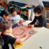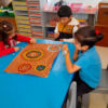 Dans un premier temps, les enfants ont réalisé une œuvre individuelle à la peinture à l’aide de coton tige. Ce genre d’activité, non seulement met en pratique la motricité fine, mais aussi la concentration car il s’agit d’un travail minutieux.