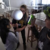 Avec un pique et une boule de polystyrène, avec une lampe on a regardé les phases de la lune. On a utilisé notre tête comme la Terre, la boule comme la Lune et la lampe comme le Soleil.