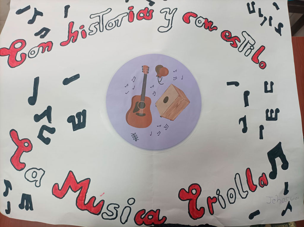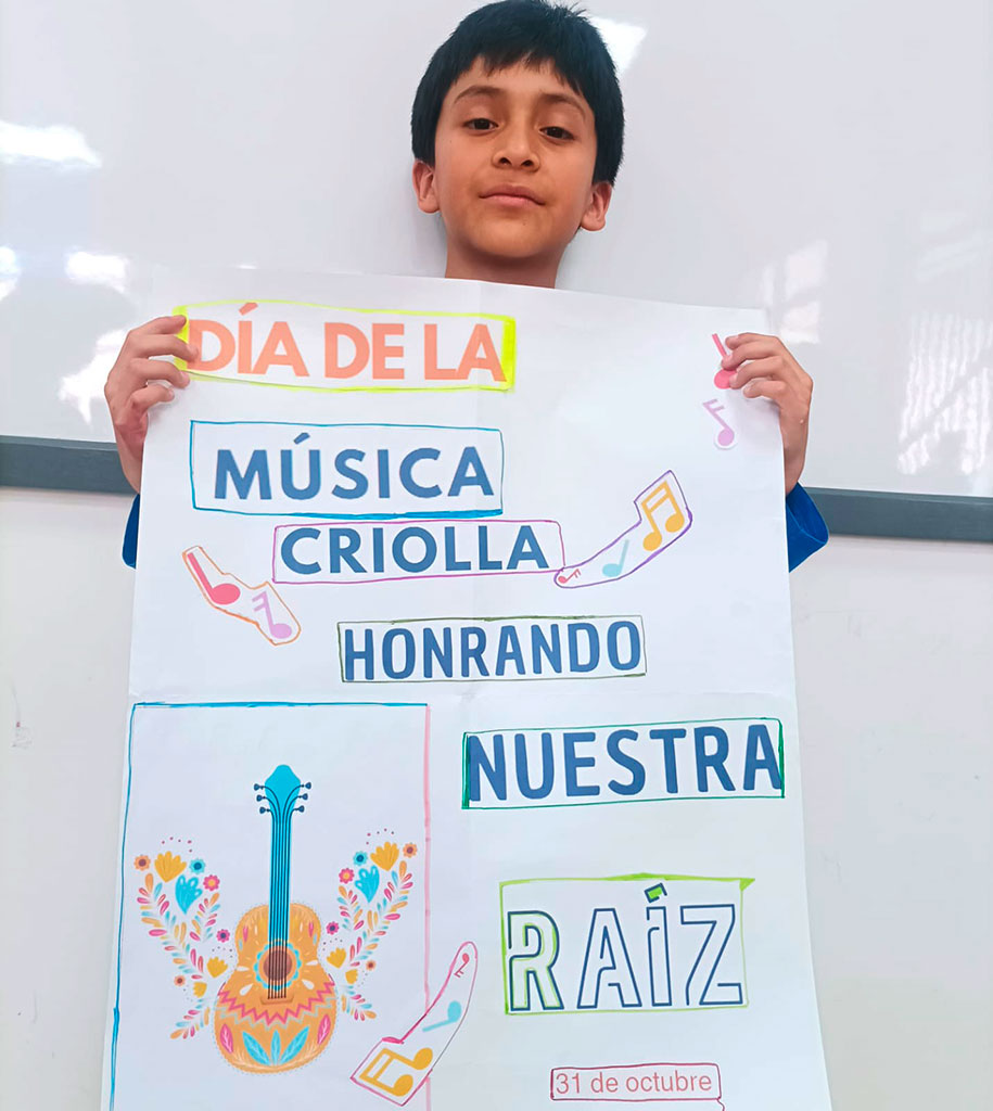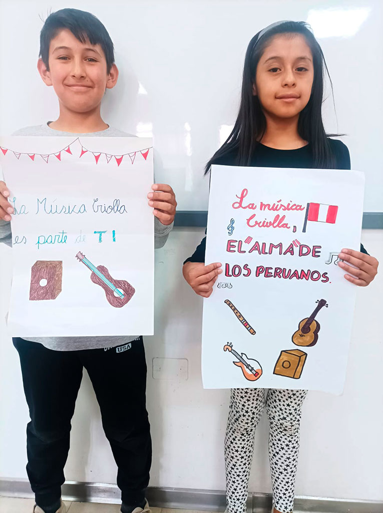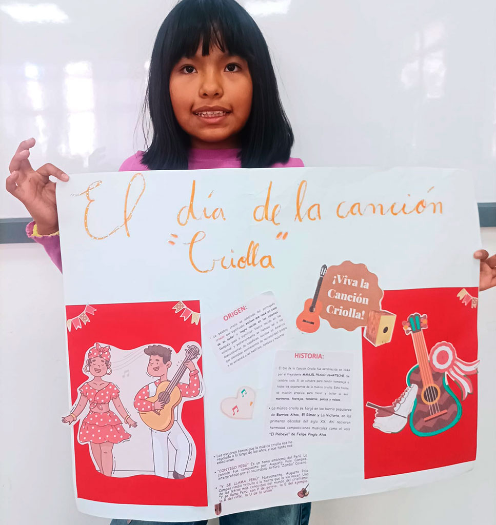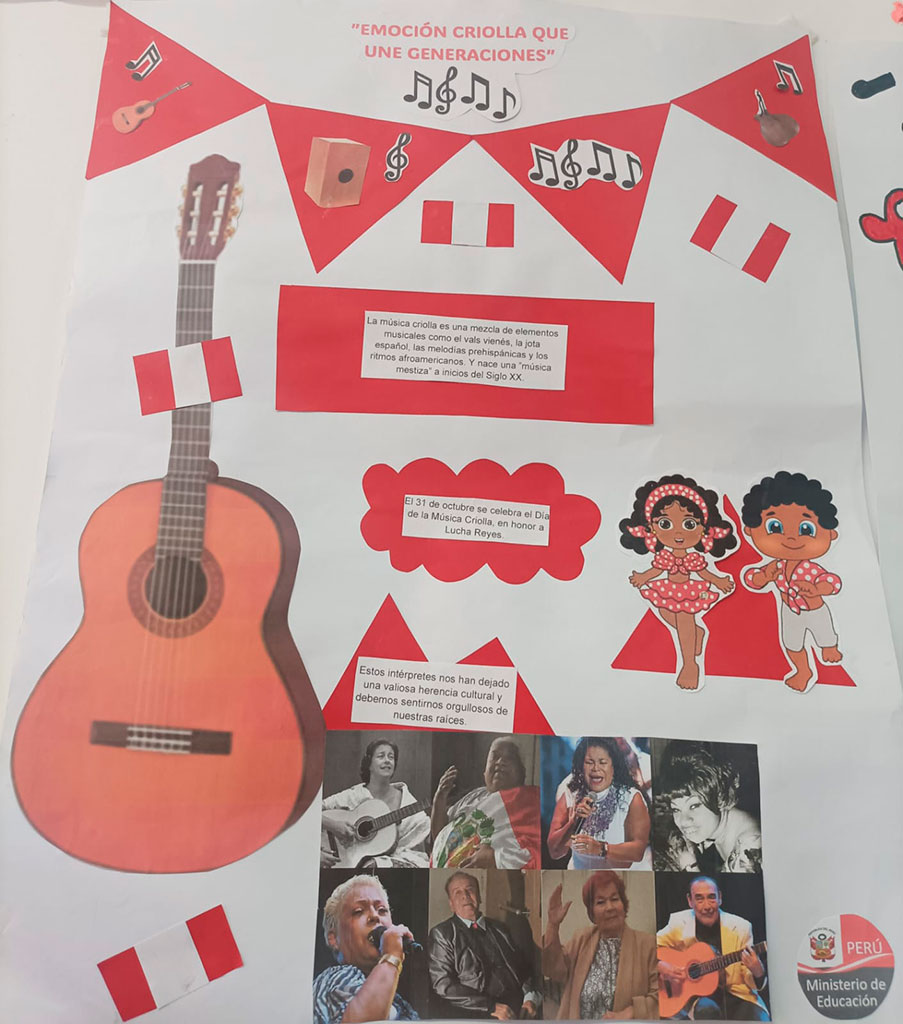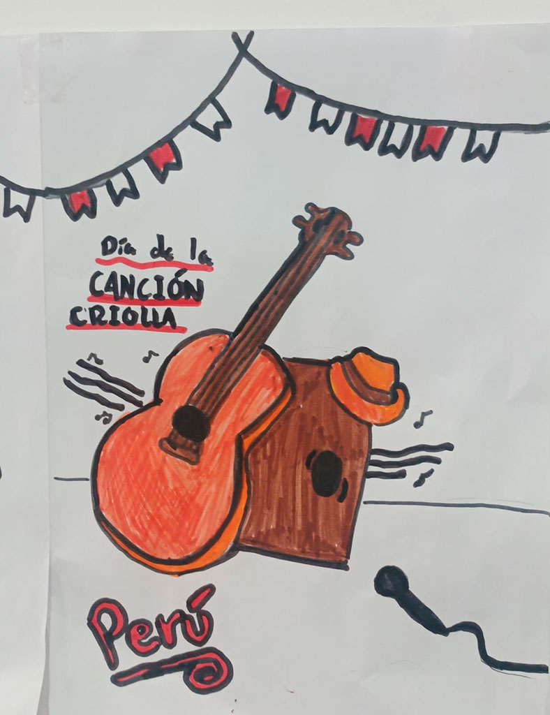 La música criolla es el reflejo de nuestra historia: una hermosa fusión de culturas africana, indígena y europea, que con el paso del tiempo dio vida a una identidad musical profundamente peruana. Por lo tanto, los estudiantes de CM1 y CM2 investigaron sobre su origen y elaboraron coloridos carteles para celebrar esta valiosa aculturación musical, que nos invita a valorar nuestras raíces y sentir orgullo por lo que somos.