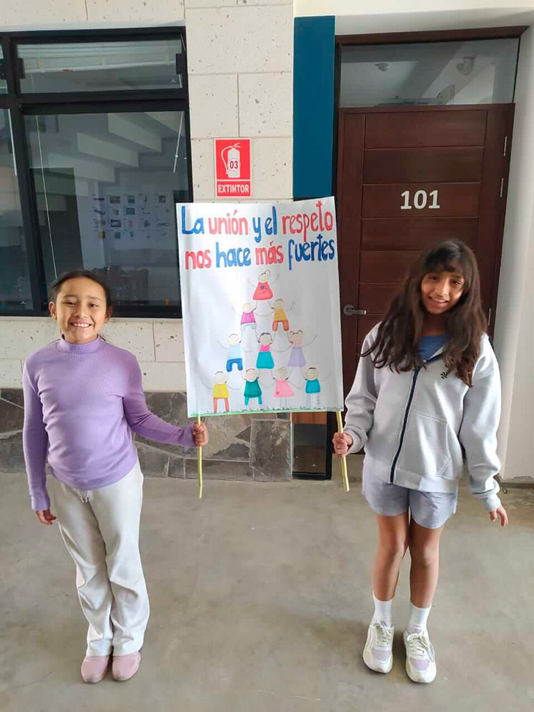 Nuestros niños y niñas de primaria presentaron carteles con mensajes poderosos sobre el respeto, la solidaridad y el compañerismo. A través de colores, dibujos y frases inspiradoras, nos recordaron que cada uno puede construir un colegio más amable, seguro y feliz.